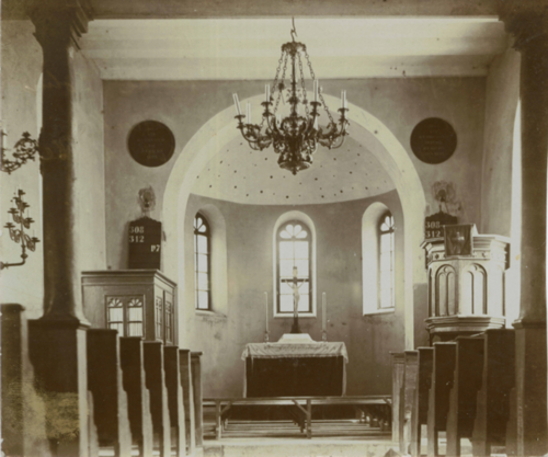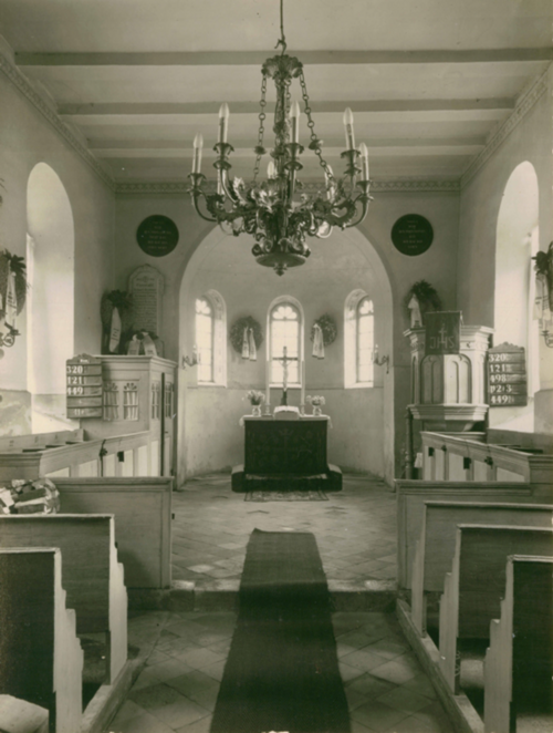 Heute geben nur noch die zufällig wiedergefundenen und restaurierten Messingleuchter einen Hauch von der damaligen Heimeligkeit unserer Kirche.