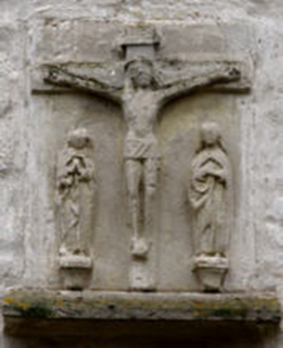 Der nächste belegte Bauabschnitt der Kirche ist ein beurkundeter Jahresstein. Früher war der Eingang in das Gotteshaus durch eine an der Südseite der Kirche angebaute Vorhalle, die als Tauf-, später als Leichenhalle benutzt wurde. Über diesem Eingang war die hier zu sehende steinerne Kreuzigungsgruppe eingelassen. Der besagte Jahresstein mit dem römischen Zahlzeichen 1497 war unter der Kreuzigungsgruppe angebracht. Leider ist er seit dem Abriss der Vorhalle verschollen.